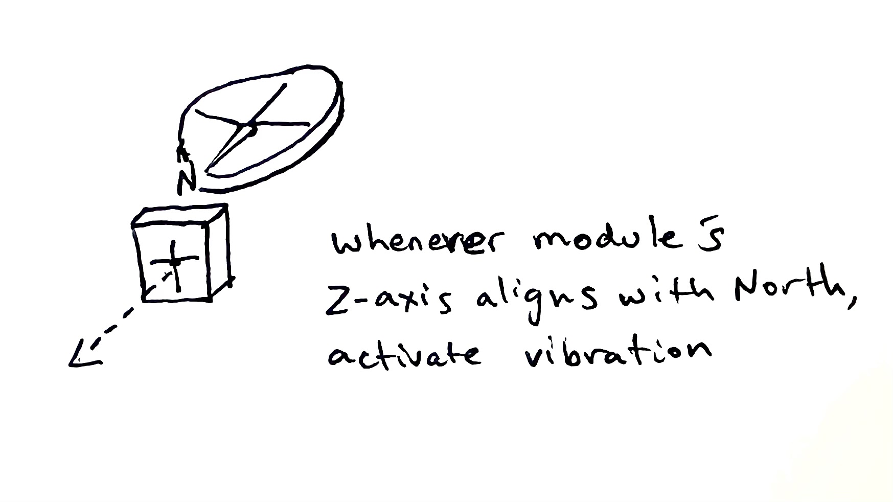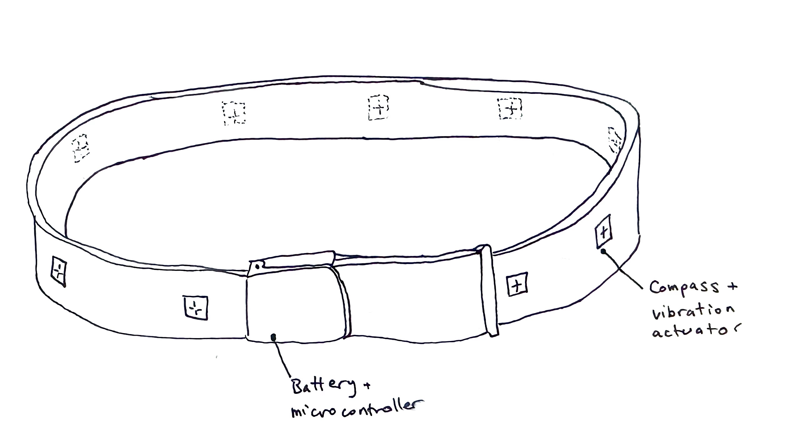 A normal-looking leather belt that vibrates in the direction of north. Embedded with compasses and vibrators, as well as a microcontroller and battery, the MVP of this idea simply has an on-off switch and vibrates whichever vibrating actuator is facing north whenever it faces north (So if the user were to spin in circles, the belt would vibrate in a wave around the user).