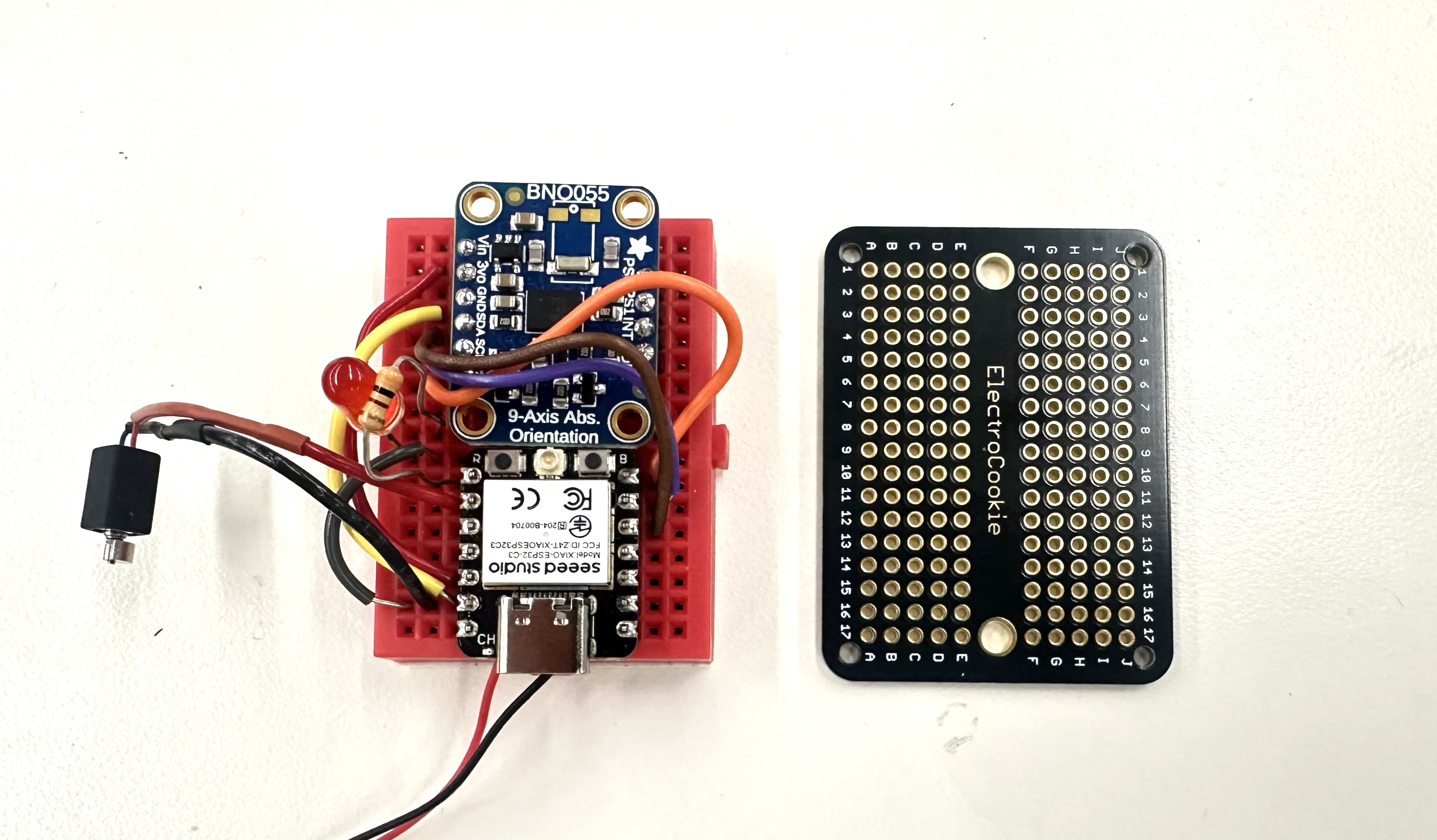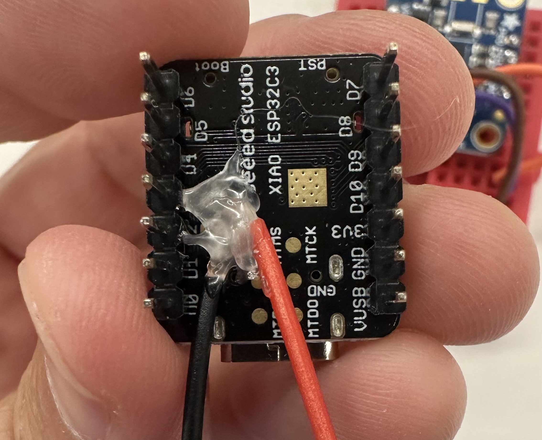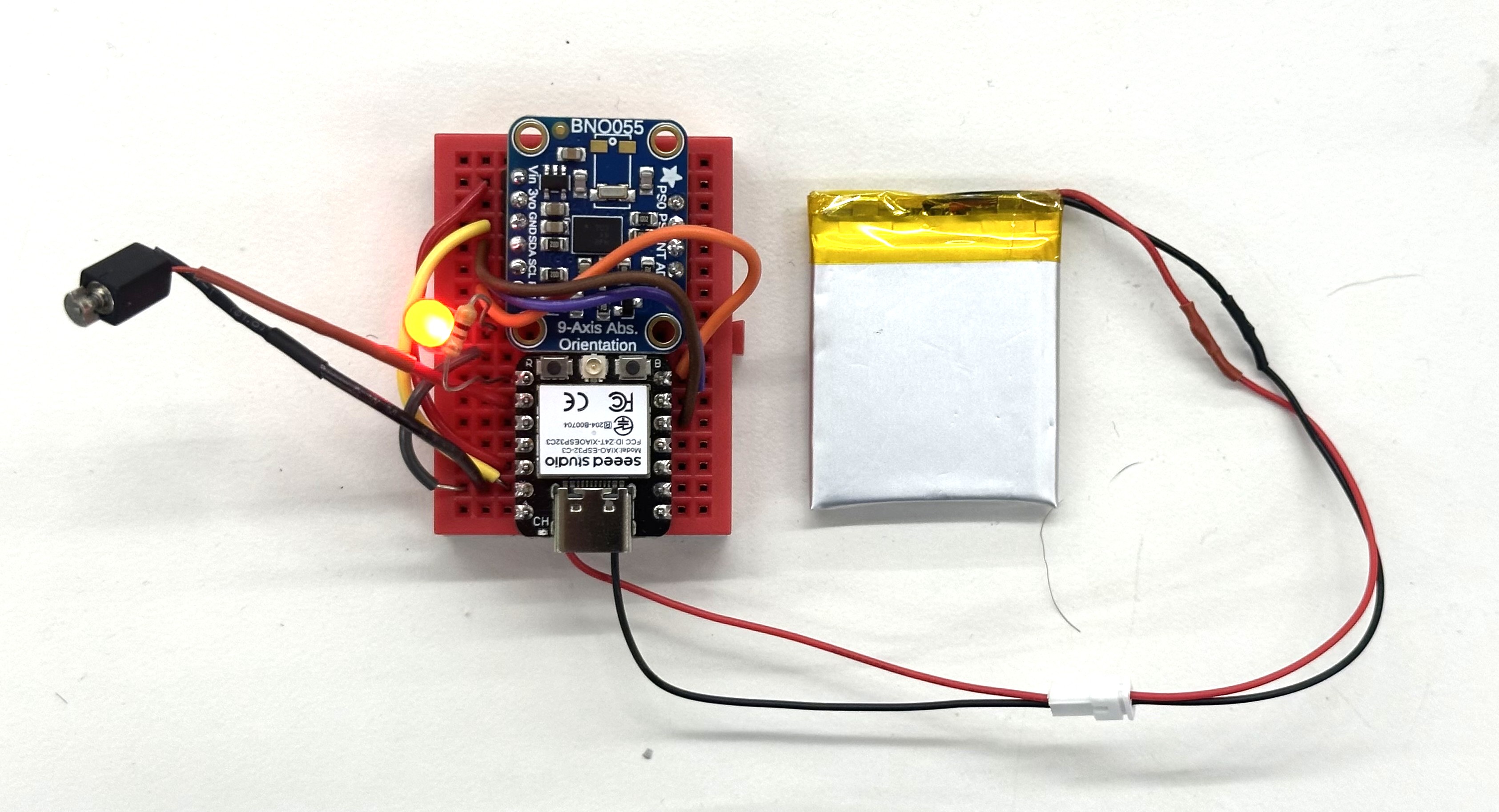 The battery is a 3.7V battery that fits directly behind the prototyping breadboard. I soldered it to the Xiao's +/- terminals via an outlet cord, so that I could replace the battery in the future without needing to resolder anything or rip apart the board.