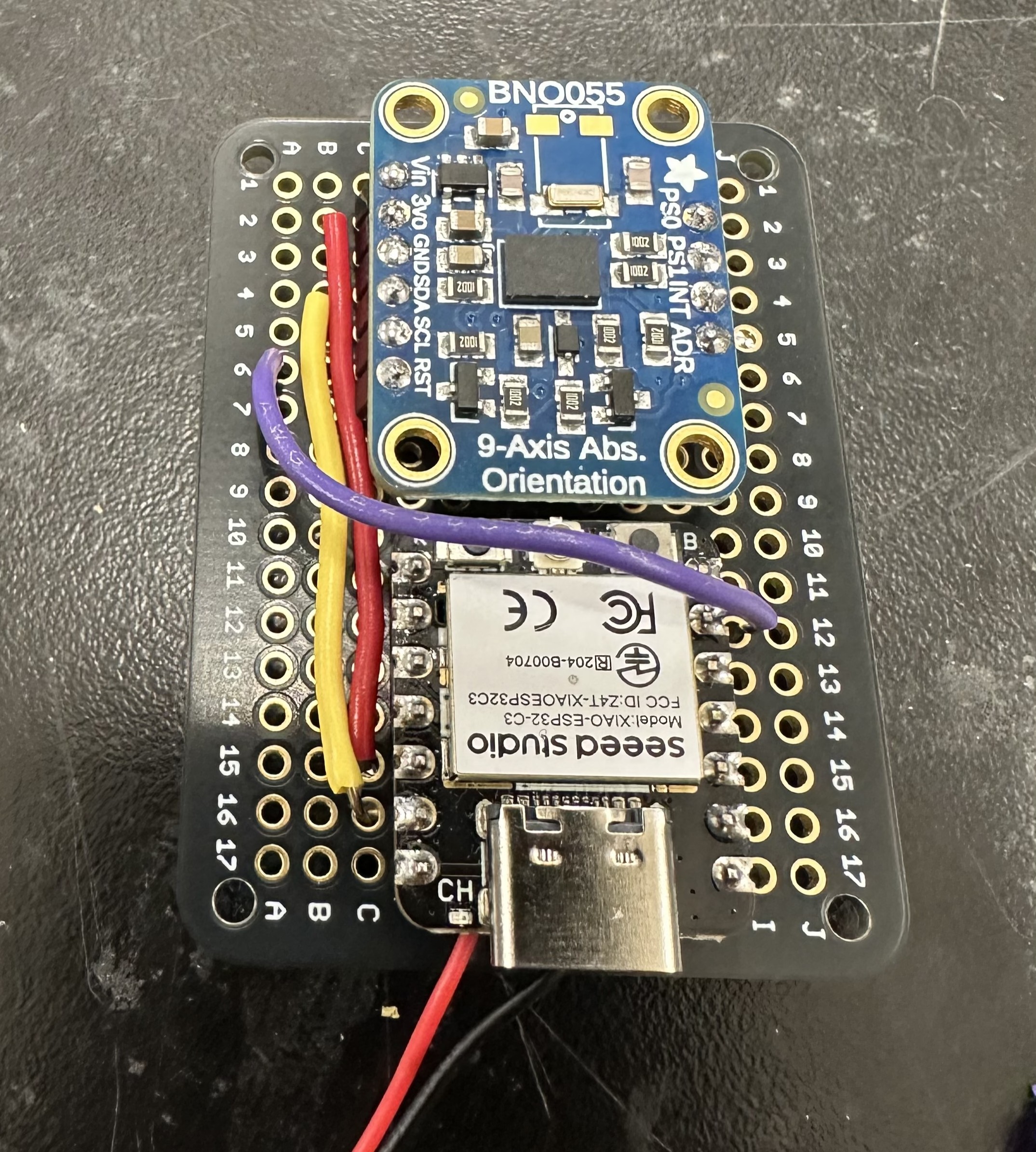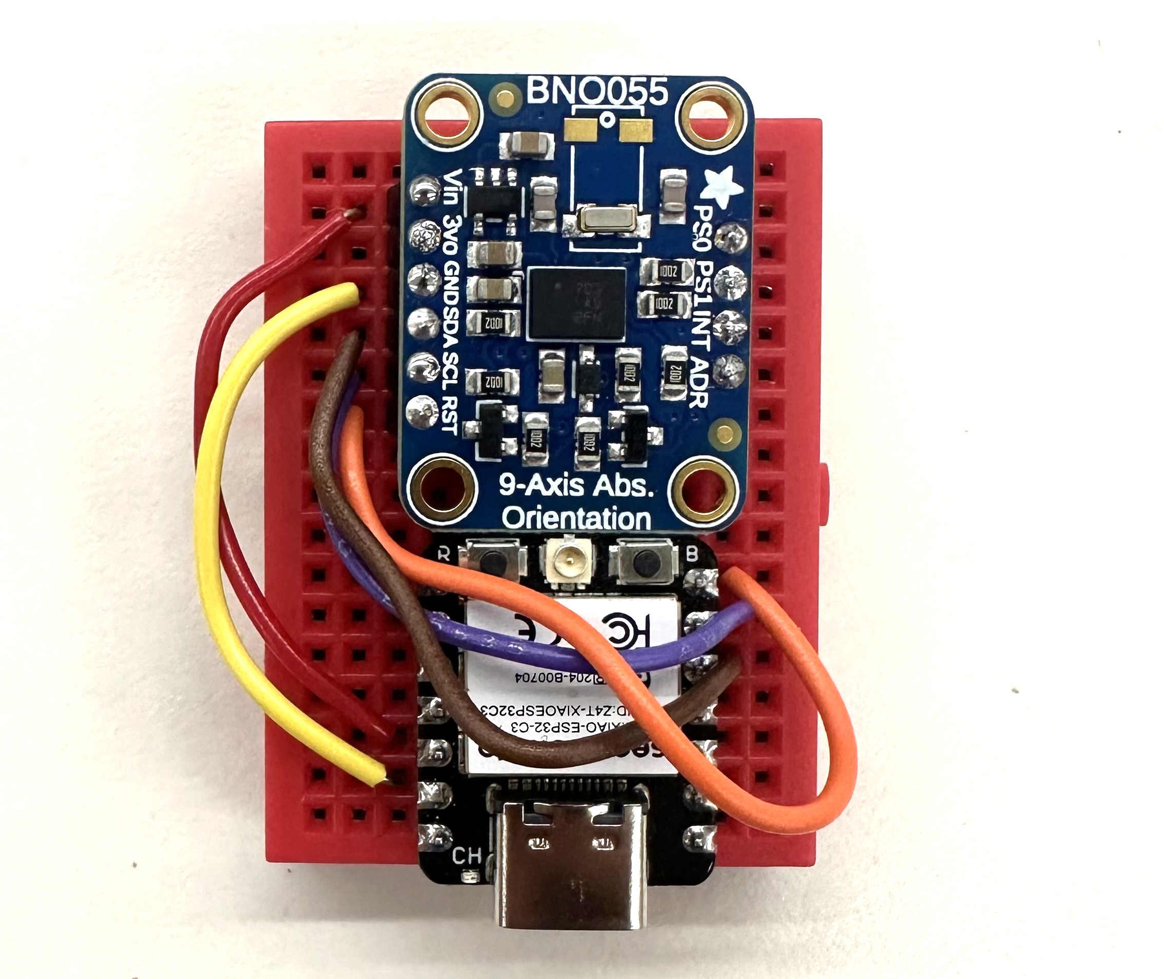 Once the Bosch was working, I wired in an LED to turn on and off when the BNO055 pointed north -- this way I wouldn't have to rely on the serial monitor in Arduino IDE to tell. The LED is wired in series with a resistor and attached to Xiao pin D7, and I coded it to be on always except when the board points north -- this design would by default show me that the device is on and functioning, and also communicate that the sensor is working.