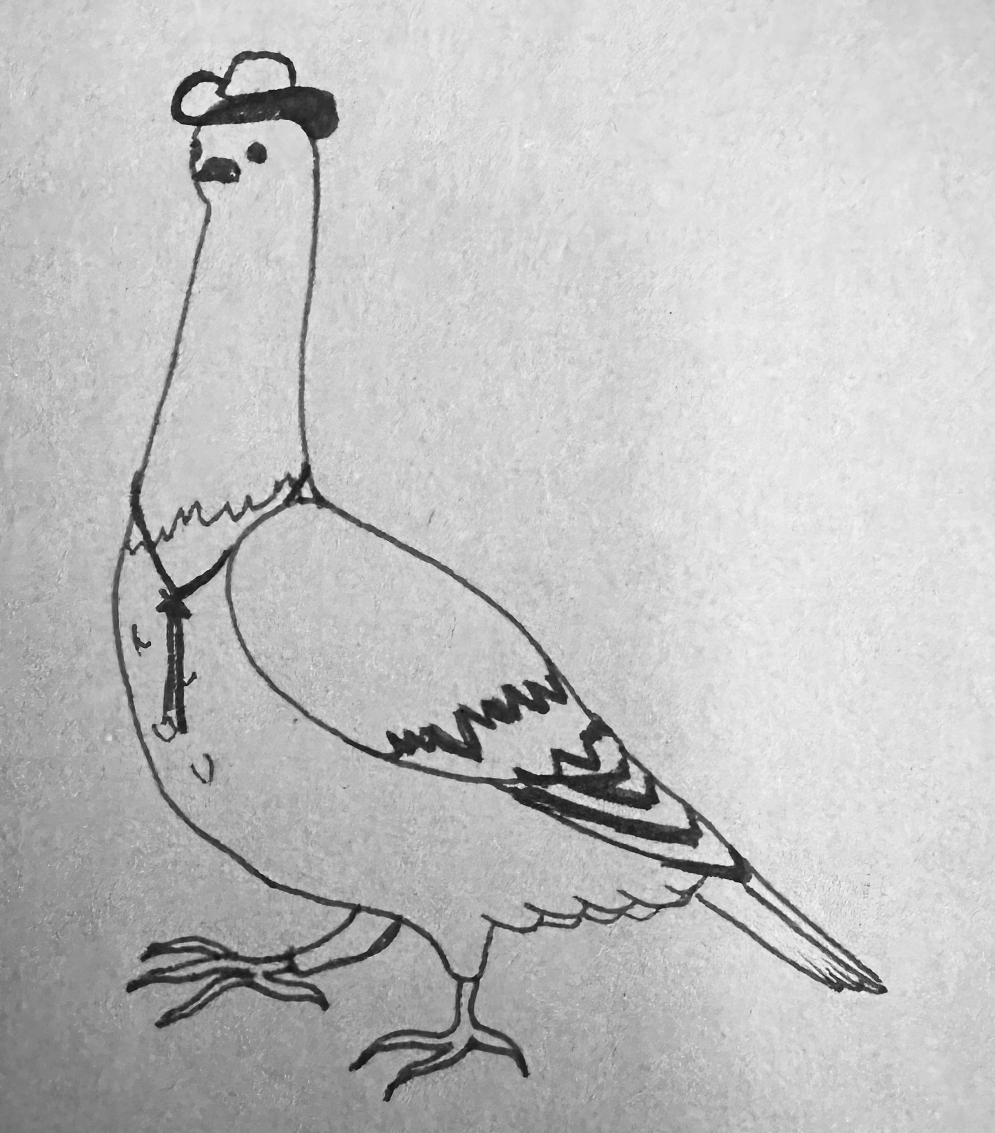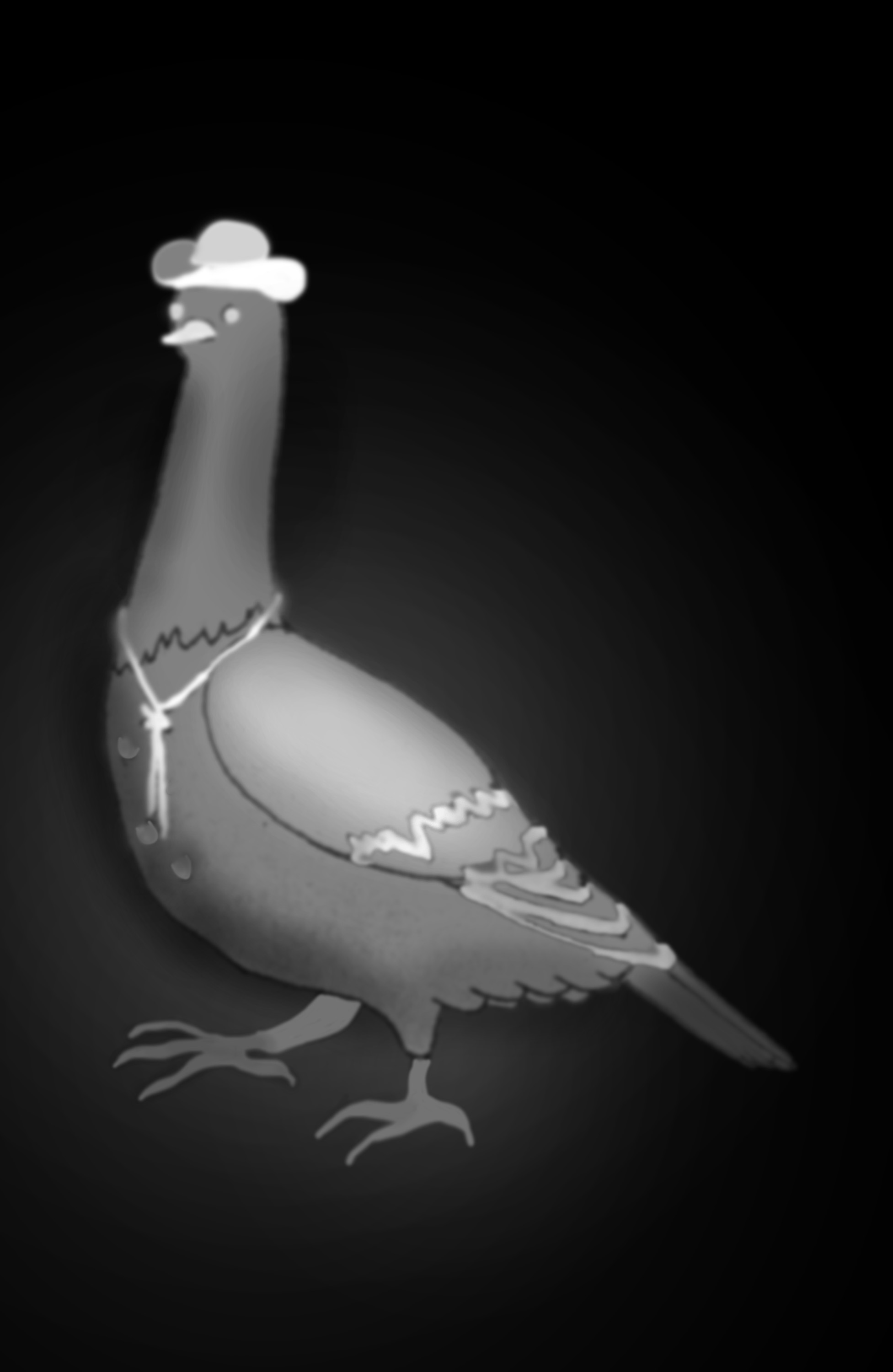 After messing around between photoshop and blender together for an hour, we got the pigeon looking the way we liked; with its hat and tie sticking out, its wing slightly curved, and the background faded in a gradient that when printed would look like a radar signal coming out from the pigeon!